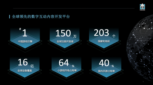 Cocos 创立于 2010 年,是本土唯一拥有独立知识产权、开源的商业游戏引擎,覆盖的领域包括 2D、3D 游戏开发、车机、在线教育、以及 XR 等方向。目前有 150 万的开发者,分布在全球 203 个国家。Cocos 拥有非常活跃的社区,社区积累了大量的内容,这些内容未来可以跨界到车机、座舱领域。