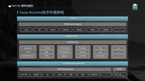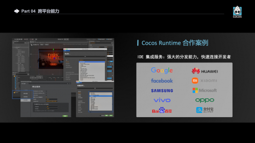 Cocos Runtime 是 Cocos 很特别的一个功能,服务于整个中国所有的手机厂商底座,包括诸多超级 App 内置小游戏的技术底座,都是由 Cocos Runtime 提供。在科技互联网领域,头部的厂商都在采用 Cocos Runtime,已经成为事实标准。