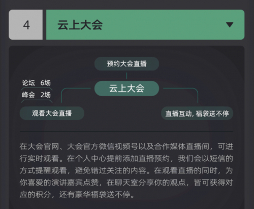 4.云上大会:在大会官网、大会官方微信视频号以及合作媒体直播间,可进行实时观看。在个人中心提前添加直播预约,我们会以短信的方式提醒观看,避免错过关注的内容。在观看直播的同时,为你喜爱的演讲嘉宾点赞,在聊天室分享你的观点,皆可获得对应的积分,还有豪华福袋送不停。
