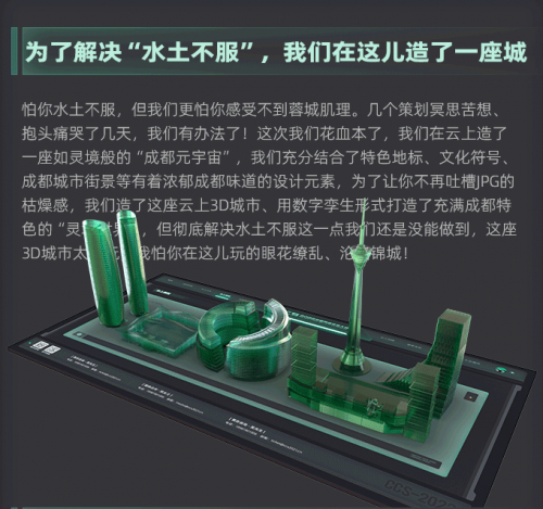怕你水土不服,但我们更怕你感受不到蓉城肌理。几个策划冥思苦想、抱头痛哭了几天,我们有办法了!这次我们花血本了,我们在云上造了一座如灵境般的“成都元宇宙”,我们充分结合了特色地标、文化符号、成都城市街景等有着浓郁成都味道的设计元素,为了让你不再吐槽JPG的枯燥感,我们造了这座云上3D城市、用数字孪生形式打造了充满成都特色的“灵境世界”,但彻底解决水土不服这一点我们还是没能做到,这座3D城市太好玩,我怕你在这儿玩的眼花缭乱、沦陷锦城!