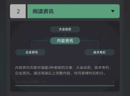 2.内容资讯:内设内容资讯页面,其中涵盖3种类型的文章:大会动态、技术专栏、企业资讯。通过阅读以上完整内容,均可获得对应积分。