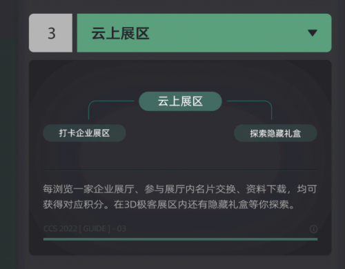 3.云上展区:每浏览一家企业展厅、参与展厅内名片交换、资料下载,均可获得对应积分。在3D极客展区内还有隐藏礼盒等你探索。