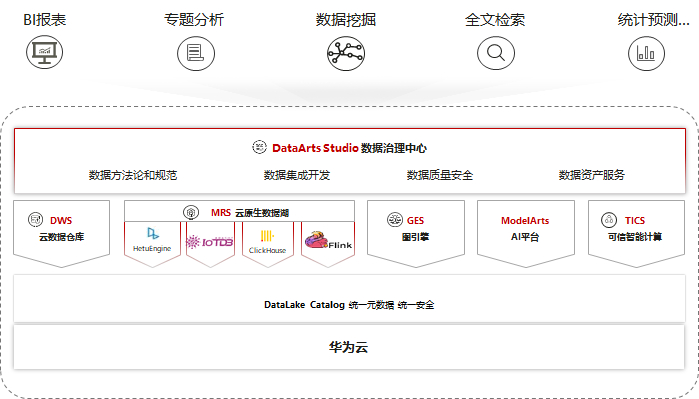 在大数据领域,基于华为云Stack云底座,FusionInsight智能数据湖提供云原生、湖仓一体的大数据云服务产品组合,包括MRS云原生数据湖、DWS云数据仓库、DGC数据湖治理中心、GES图引擎,以及ModelArts AI平台等云服务,用于离线分析、实时分析、数仓集市、交互查询、实时检索、多模分析、数据接入治理、图计算、AI训练和推理等智能分析场景,助力政企客户实现一企一湖、一城一湖,业务洞见更准,价值兑现更快。