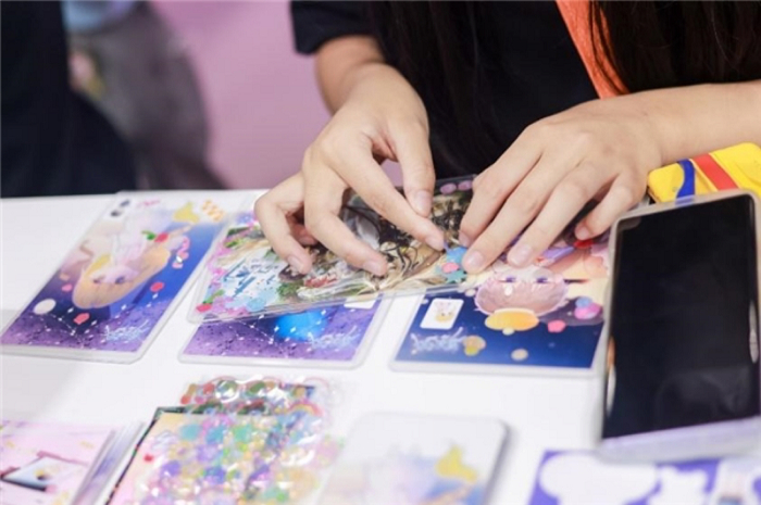 到场粉丝可以与Coser一起互动留念,将喜爱的动漫形象、漫画情节打印出来,在体验区亲手制作咕卡、贴纸等创意素材,用实际行动为喜爱的动漫角色“打Call”助力。