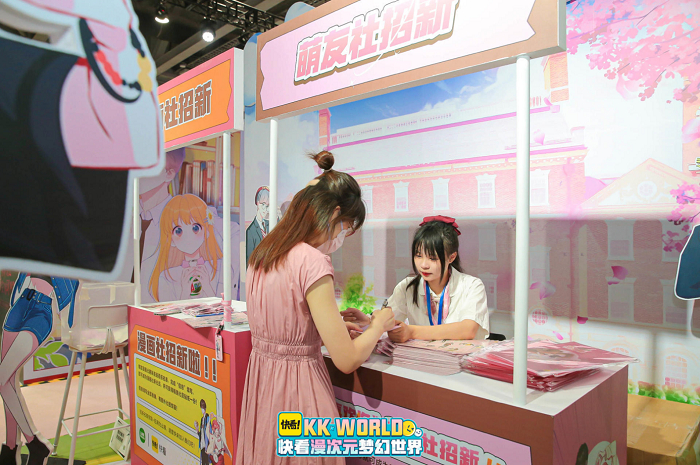 在活动中,LINE FRIENDS以漫画中男女主所在的学校社团招新为主创意,在展区中完美还原校园清新场景,设置超多打卡点吸引各式粉丝拍照。展区还以漫画中的“社团招新”为旗号,让漫迷借助招新小任务了解漫画主角团,并带领KKer们加入萌友社。