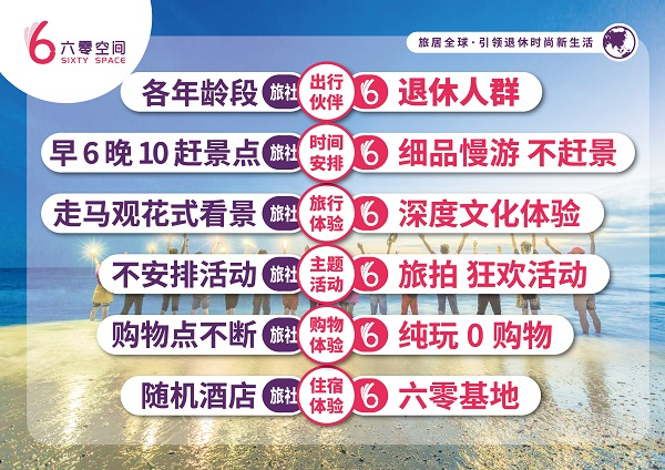 西安六零空间旅游文化有限公司在旅游行业中深耕9年,以引领退休生活新时尚为理念,专为退休人群服务 ,聚集了具有相同游玩理念的退休者40余万人,合作服务站也达100余家。2014成立年至今,带领中老年人出行累积人数20余万,出行次数达40余万次。与传统的旅游公司相比,六零空间给老年人带来了哪些不一样的旅行体验呢?