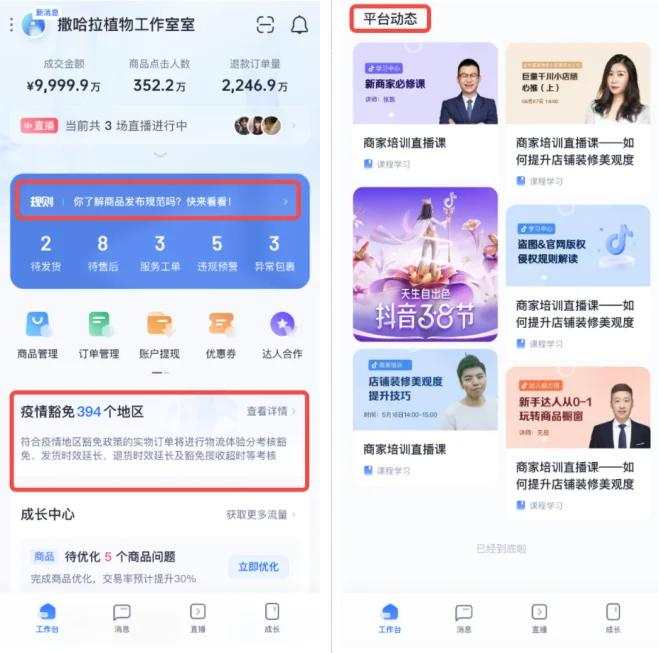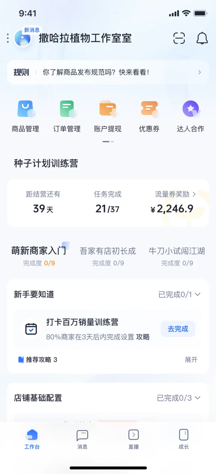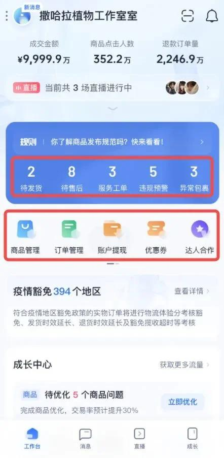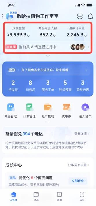 保留“工作台”,“消息”,“学习”更名为“成长”,新增“直播”:为商家提供更多内容电商所需要的经营工具与诊断建议,如“成长中心”,“直播中心”;