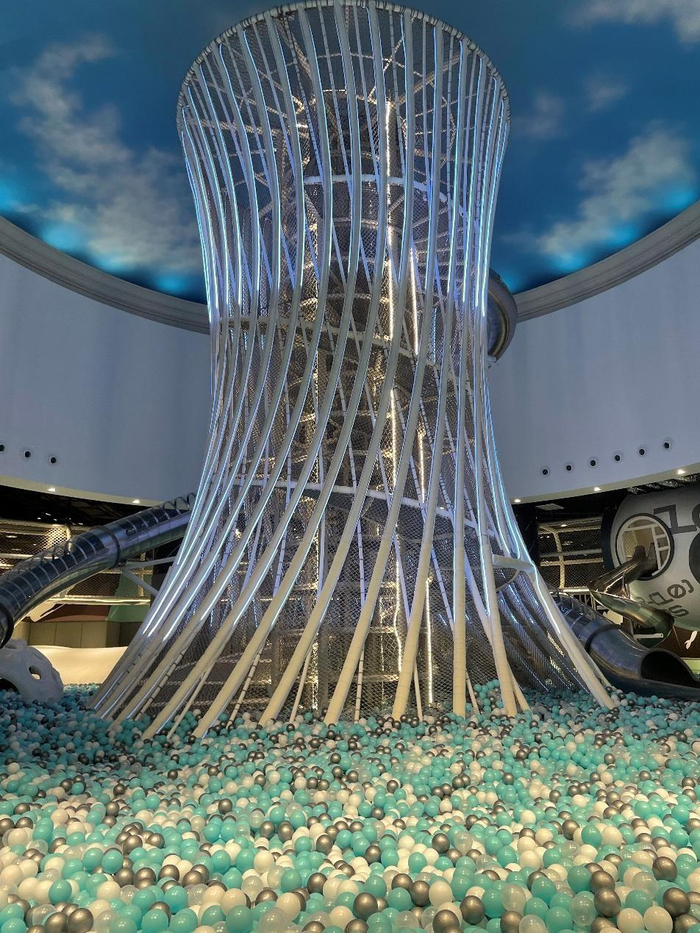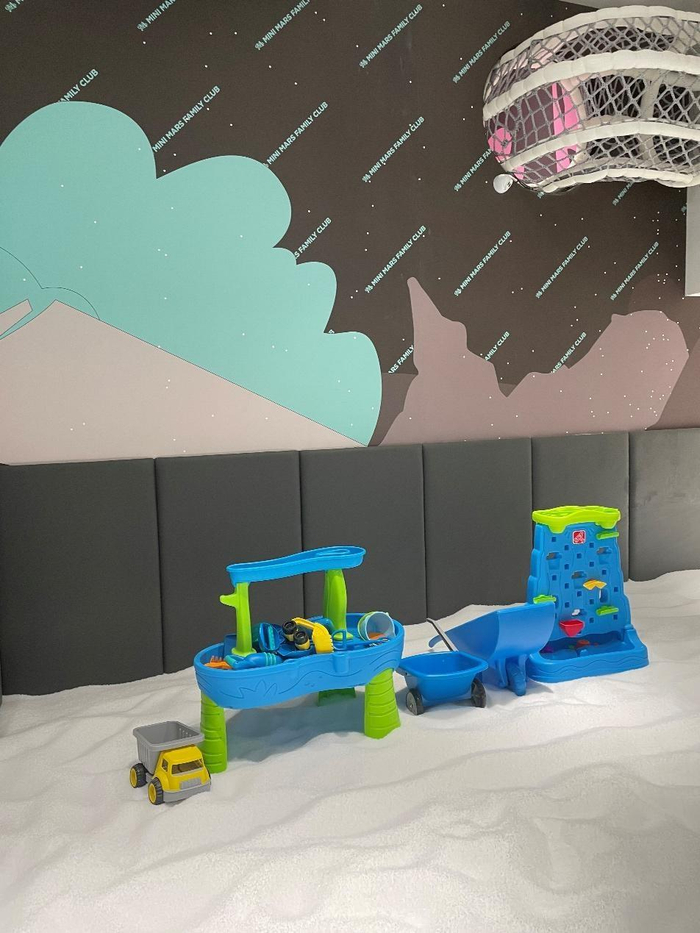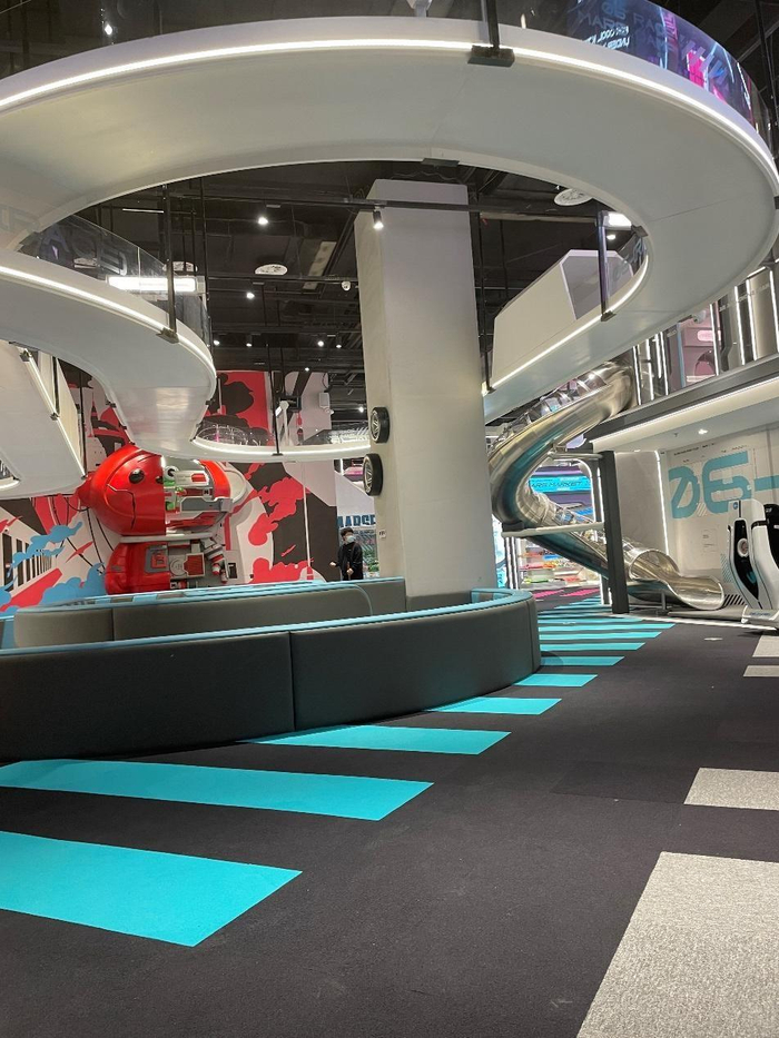 Mini Mars亲子乐园苏州门店的主题是赛博太空,给人一种穿梭在宇宙和地球之间的魔幻感,所以它的很多通道都是深蓝色调,走在里边感觉像进了太空一样。然后刚进门就能看见Mini Mars亲子乐园的地标性建筑,直插天空的攀爬网能让孩子尽情释放夏日热情,估计5岁以下的宝宝在这里玩儿之后,回家不会再闹着跟爸爸妈妈玩了,而且区域旁边有工作人员看护,安全问题可以放心。
