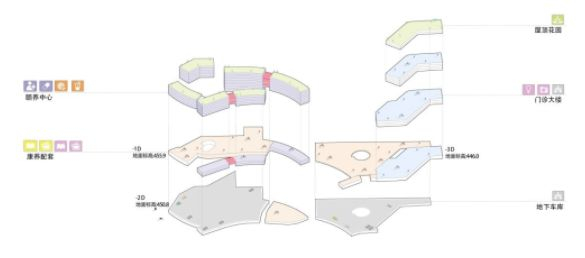 特殊的双遗文脉奠定了设计的出发点。我们从人与自然的关系、以及山石之形抽象出建筑的形式语言,并融入功能,形成最终的建筑形态。综合医院棱角分明,如高耸的山峰;康养展厅如低伏的流水,呼之欲出;中部的康养中心则在刚柔之间进行承前启后的完美过渡。不同形态的体块堆叠,形成梯度变化的建筑轮廓线,与相邻场地的建筑形态互补。