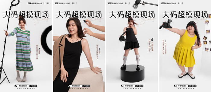 在这个“提问-解决”式的内容场中,挑战赛将小众人群的痛点变成了一次全民审美升级活动。作为挑战赛活动的尾声和升华,抖in新风潮·百变衣橱从参与者里邀请了几位大码女孩参与ELLE时尚大片拍摄,其中包括大码女装测评达人,品牌商家的主播、代理人等,更有晶咕、纤莉秀等核心头部大码女装品牌倾情加盟,老牌时尚媒体的背书无疑令活动的传播声量再上一个台阶。