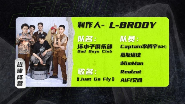 第二组是由L-Brody制作人带领的“坏小子俱乐部Bad Boys Club”战队,队员包括Captain李舸宇(队长)、慕斯塔法、$limMan、Realzat、AIFI艾阀。一首十分炸裂的《Just Go Fly》将整个场子的气氛都带了起来,队友之间完美配合,台风稳健获得好评,是十分高能的舞台。