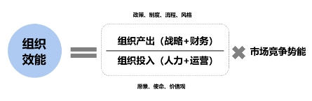 对此,安恒信息的HR团队给组织效能 列了一个公式,认为组织效能等于组织产出除以组织投入,再乘以市场竞争势能。 按照这种思路,可以明确的是,若想提升组织效能,需要兼顾内外部因素,既要对外做好市场竞争分析,又要对内控制成本、激发产出。