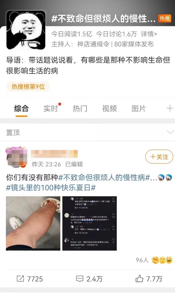 进入暑期以来,很多夏季高发的慢性病例如湿疹、胃炎等困扰了很多网友,日前一个#不致命但很烦人的慢性病#话题也登上了微博热搜,该话题在1天内就引发2.5亿人阅读,3万网友参与讨论,在话题里,皮炎湿疹、慢性胃炎和慢性咽炎是大家讨论最多的话题。大部分网友表示这些不算太大的慢病反复发作真的很闹心,又很难抽出时间专门去医院看这些“小病”。