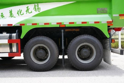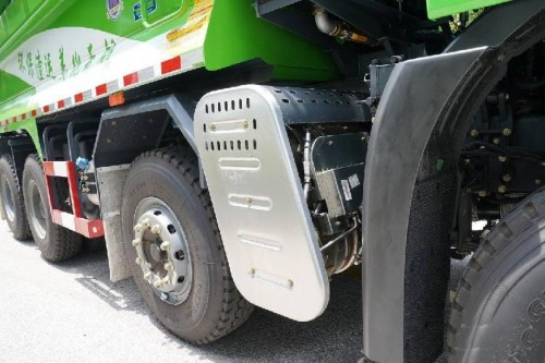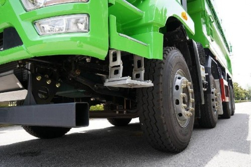 说完动力链匹配,我们再来聊聊这款解放J6L 8×4自卸车的转向和通过性。实拍车型的转向机为新开发的大缸径变速比产品,转向的手感非常轻,而且响应很快。还有该车的转向桥到驱动桥之间的轴距仅为2250mm,前桥的转向角由之前的45度增加到47度,将其转弯半径缩小1.2米,在通过一些狭窄场地时更轻松。