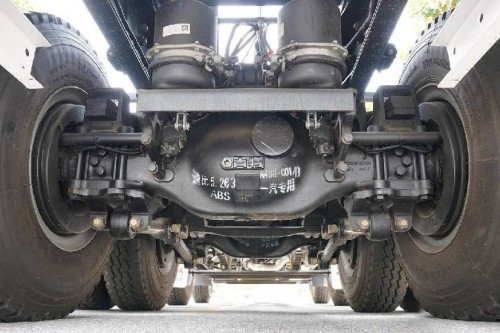 在后悬架部分设计上,该车平衡轴的大支座是和车架的副板、翼板同时进行连接,其好处就是在重载车况下它的变形量会更小,可靠性会更高。而且平衡轴还采用一体式的免维护橡胶衬套,无需对它进行任何的保养和维护,还具备有很强的减震效果。
