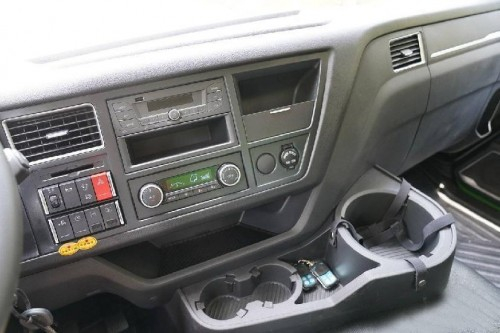在中控台设计上其配置算不上很豪华,这也是因为自卸车的运营范围比较小,避免一些豪华配置也可以节省买车成本。不过该车中控台是配置有多个开放式储物槽和水杯托架,这是考虑到自卸用车需要很多分散的小储物空间,用来放置票据、水杯之类的物品。