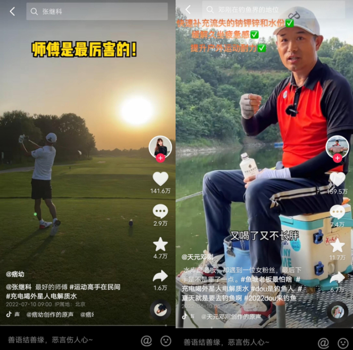 在短视频种草方面,外星人凭借产品卖点与健康运动场景的高匹配度,在运动垂类达人的种草上别具巧思,效果拔群。例如,深挖今年在抖音内容热度提升的钓鱼圈层(“天元邓刚”、“天元王稳”等),投放内容热榜频出(天元邓刚,点赞量150w+),用户评论区互动频繁「外星人是捅了钓鱼人的老窝吗」。此外,痞幼X张继科联动视频也引起很好的反响,在户外高尔夫的场景的加持下,“外星人电解质水”运动出汗后给身体补充电解质的卖点深入人心,同时短视频中痞幼X张继科的首次联动也引起广泛反响,相关话题登上站外体育榜前列。据外星人透露,外星人品牌自播在618大促期间达成单场次100万GMV的好成绩。