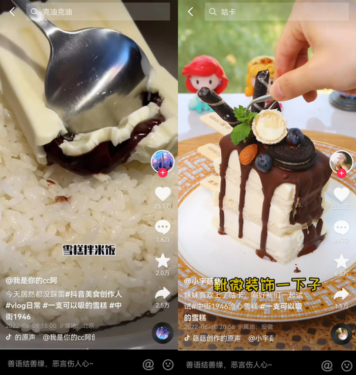 以中街1946投放的爆款内容创作为例,美食达人选用奇怪且意想不到搭配的网红美食,通过意想不到的创意美食来引发人的好奇心,从而提升视频播放量。达人通过在“雪糕拌饭”的热点话题中植入中街流心巧巧,进行大篇幅的产品露出和试吃分享,强化种草效果。或是结合产品的流心、牛乳等特点,将雪糕搭配多种流心酱做成不同美食,既富有创意又有食欲。