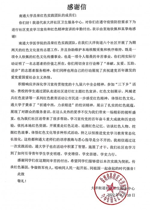 在活动的第一站,为积极响应并深化学习宣传贯彻党的十九届六中全会精神,南通大学昌荣红色实践团队于7月5日至7月10日前往盐城市大洋街道盐海社区、海悦社区、育才社区等6个社区开展“传承红色基因,强国复兴有我”主题红色宣讲活动。在宣讲会上,团队成员向广大社区民众播放了团队自制的“从身边的红色资源 汲取奋进力量”为主题的微团课、微党课宣传视频。并且详细介绍新四军将士用鲜血和生命凝聚成的铁军精神以及新四军的浴血奋斗的战争史。