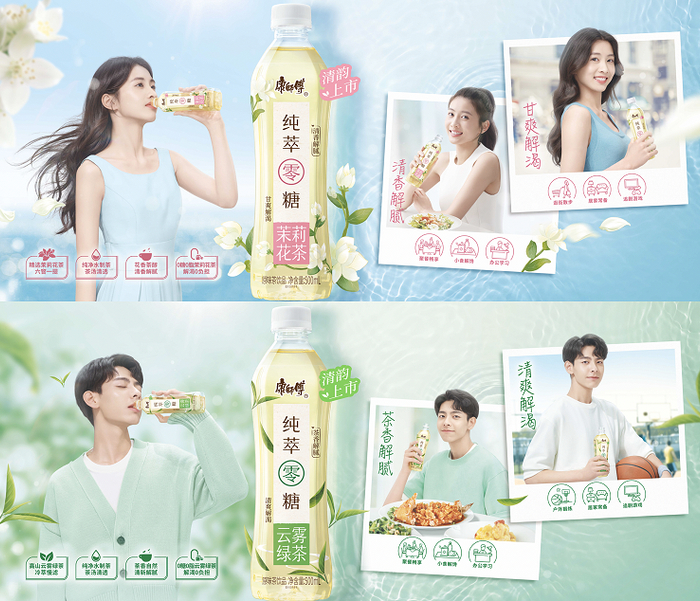 正是敏锐洞察到消费者的健康需求以及饮品市场趋势,康师傅重磅出击推出康师傅纯萃零糖,主打的“0糖0脂0能量”完美迎合了当下年轻人的健康消费潮流。不仅仅是零糖概念,康师傅纯萃零糖还真正做到了原茶0添加,其精选茉莉花茶和高山云雾绿茶,采用冷萃慢滤工艺,用纯净水制茶,“淡淡茶香 纯萃零糖”,比水更好喝,比茶更解渴,直戳消费者喝水解渴但平淡无味、纯茶浓郁却不够清爽以及追求健康好喝无负担的痛点。其中,茉莉花茶“清香解腻,甘爽解渴”,云雾绿茶“茶香解腻,清爽解渴”,两款口味选择,双倍纯粹美味。