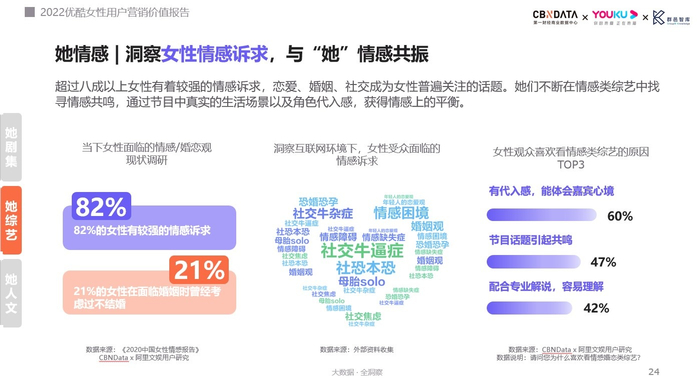 《报告》显示,超过八成的女性有着较强情感诉求,婚育、社交、恋爱是她们普遍关注的话题。因为有代入感,能体会嘉宾心境以及节目话题引发共鸣是女性观众喜欢情感综艺的最大原因,优酷洞察现今女性的情感诉求,通过不同人生角色的情感综艺,舒缓女性观众情感压力,为她提供精神疗愈与情绪价值。