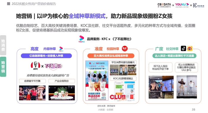 在营销上,优酷以优质IP为核心,深度圈粉年轻用户,提升品牌声量。比如肯德基借力优酷自制综艺《了不起舞社》,深入百大高校消费场景,利用KOC及社群、社交平台话题发酵,以内容种草、校园种草、社交种草进行全域传播,全面占领Z世代女生心智,促使肯德基新品实现爆发。