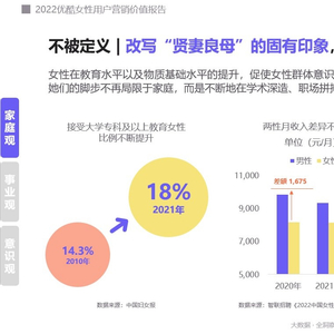 《报告》显示,70%的女性有婚前购置房产的想法,其中11%的女性已经在婚前完成购置。在教育水平方面,接受大学专科及以上教育的女性比例从2010年的14.3%上升到2021年的18%,一年增幅超过25%。而男性与女性之间的月收入差异也在不断缩小。随着女性教育水平与经济基础的提升,女性群体对婚前买房、是否结婚、生育等“人生大事”的观念变得更加多元开放,他们对自我的角色定位不再局限于“贤妻良母”,而是在读书深造、工作升职中不断体现自我价值。