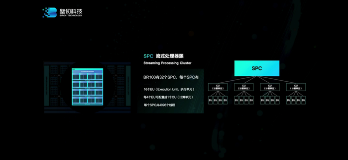 放大计算核部分,这是流处理器簇(SPC),采用标准化的模块化设计,上面能跑4096并行线程。一个SPC内部包含有16个EU(执行单元),每4个EU可配置成1个CU(计算单元)。一个BR100内部有32个这样的SPC流媒体簇。