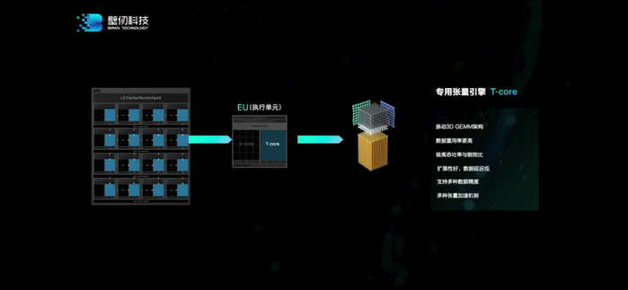 另一个部分就是tensorcore。“我们的做法和业界不大一样。我们的tensor核是完全集成在向量核里面的,作为向量核的加速器。”洪洲说,“其优点在于,可以把16个tensor核连在一起,达成更大的tensor核,让矩阵运算效率得到极大提高。我们算下来大概能提高30%。”