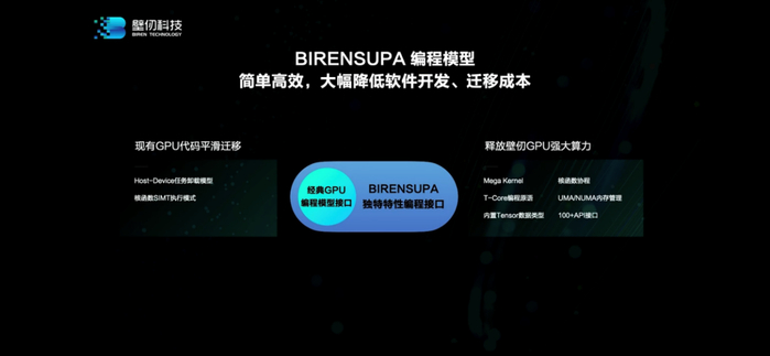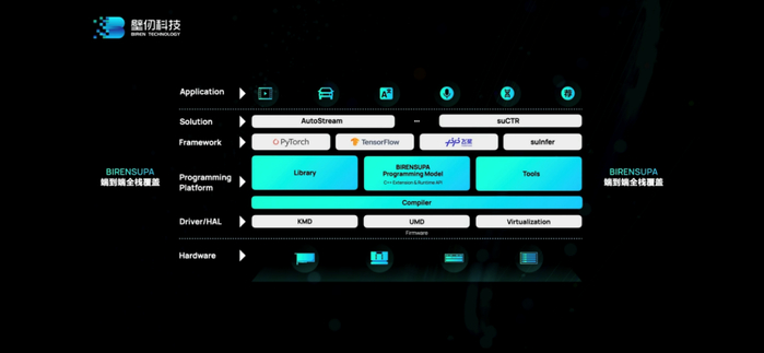 上面这张图是壁仞的BIRENSUPA(以下简称SUPA)软件全栈,从驱动、硬件抽象层、编程平台、框架,到具体的解决方案和应用。除了相关壁仞GPU自身架构特性的一些接口(下文架构介绍中也会有涉及),这里比较值得一提的包括框架层支持PyTorch、TensorFlow,和已经在合作中的百度飞桨PaddlePaddle——百度也出现在发布会上,给出了“产品兼容性证明”;框架层有个壁仞自研的推理引擎suInfer。
