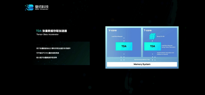 架构层面的另一个亮点在于TDA(TensorDataAccelerator)张量数据存取加速器。这个加速器用于offload计算单元(SPC)的数据存取工作。“它是个专门的加速器,像数据的加压、解压、地址计算、同步。它能让计算和数据搬动做到异步。”