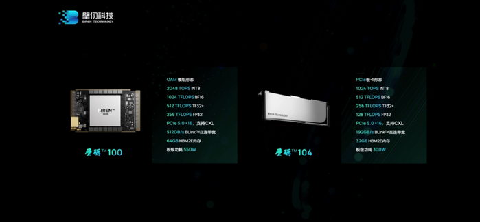 更往上的板级系统层面,BR100、BR104芯片当然是需要对应到具体的产品形态的。这次壁仞发布了两款具体的硬件产品:壁砺100和壁砺104,分别应用了BR100和BR104芯片,这两款产品分别以OAM(OCPAcceleratorModule)模组与PCIe板卡的形态存在。算力规格之外,功耗分别对应550W和300W。