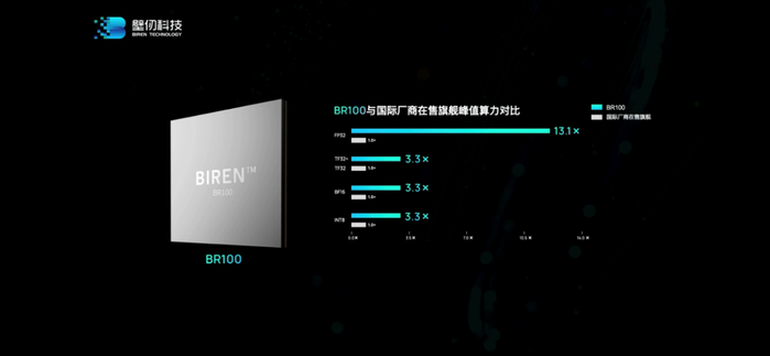BR100的理论算力水平如上图所示,不同格式与精度的算力值,对应于BR100在训练和推理方面的适用性。壁仞提到的“全球算力记录”和突破PFLOPS,应该就是指BF16格式(1024TFLOPS)。