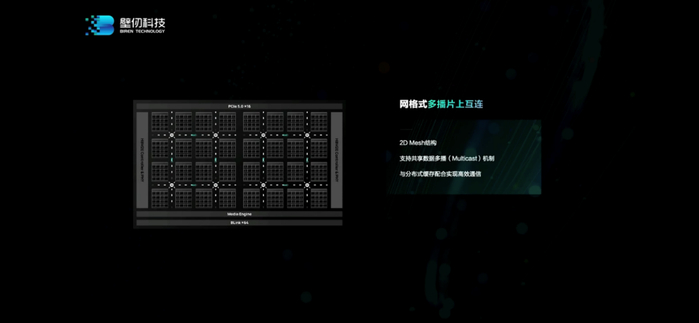 BR100所用的片上网络(NoC),为“网格式多播(multicast)片上互连”。“权重一般来说是可以共享多播的;当你跑模型并行,trainingsample也可以共享多播。这样就能极大减少对内存的带宽压力,减少片上网link的带宽压力。”