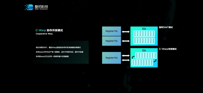 比如C-Warp协作并发相比于传统GPU的warp和warp之间不能直接通讯(需要经由cache来交换数据),“我们这种模式可以藉由一些同步方式,通过RegisterFile来直接传递数据,也就减少了数据的搬移。”
