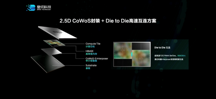 从壁仞科技联合创始人、CTO洪洲的介绍来看,BR100明确采用了台积电的2.5D CoWoS-S封装方案——两片die和周边HBM2e内存都放在一片硅中介(silicon interposer)上。我们在刚刚发布的《先进封装的现在和将来》一文中详细介绍过这种先进封装技术,国内厂商在用的应当还寥寥无几。