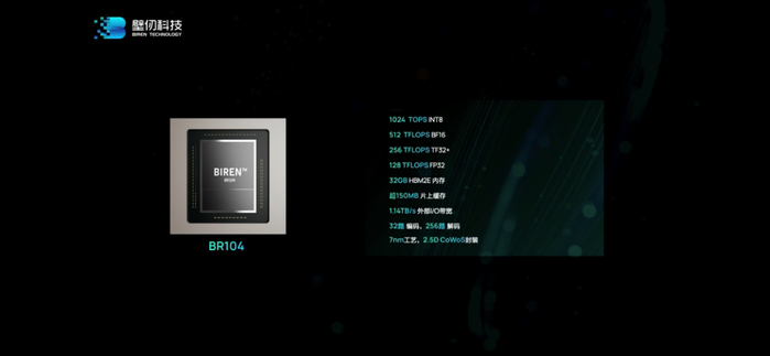这次壁仞科技发布了两颗芯片:BR100和BR104。这两者的区别主要在于BR100是两片相同的die(或chiplet)封装到一起;BR104则只用了1片die,所以相关算力与IO等参数大多为前者的一半,适配不同的市场需求。