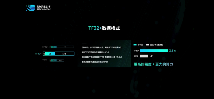 “我们的TF32+,精度bit有15bit(E8M15),TF32就只有10bit。我们增加了5bit,相当于增加了32倍精度。”洪洲说,“即使这样,我们的TF32+算力仍然是头部厂家TF32的3.3倍。”所以最终达成了“更高的精度”和“更大的算力”。