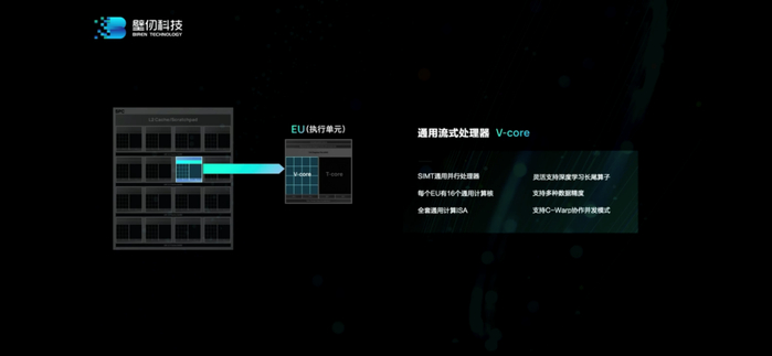 放大其中的EU。一个EU主要包含两部分,一部分是“通用流式处理器(V-core)”。“我们采用了SIMT通用并行处理器”,BR100的“通用性主要就来自这个处理器,它支持各种各样的指令,而且是完全并行的通用架构”。这部分应该也是能够兼容CUDA的原因。