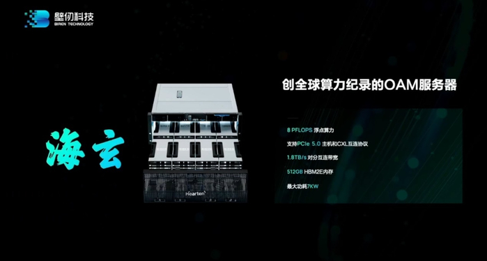 值得一提的是,本次发布会上壁仞特别宣布了与浪潮合作推出的OAM服务器:海玄。这台服务器的理论峰值算力(BF16)达到8PFLOPS;512GBHBM2e内存;支持PCIe5.0和CXL;1.8TB/s对分互连带宽;最大功耗7kW。