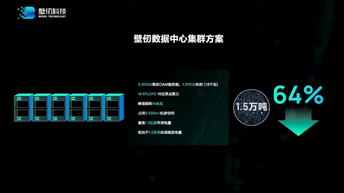 而如果换成OAM服务器海玄,“只需要2000台海玄服务器,达到16EFLOPS的算力;只需要1000个机柜,占地面积不超过3500平方米,峰值功耗14兆瓦,1.2亿度年用电量,相当于1.5万吨标准煤发电量,实现了整体方案64%的成本下降。”