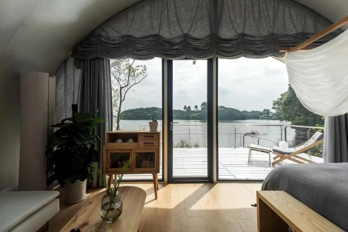 房间造型似宫崎骏动漫中的贝壳房,整个设计感十足。每个房间总面积50平米,整体简约,大床舒适,50平米的上下错层露台,白天可以躺着晒太阳吹湖风,夜晚则可以在阳台上独享烛光晚餐,浪漫至极。