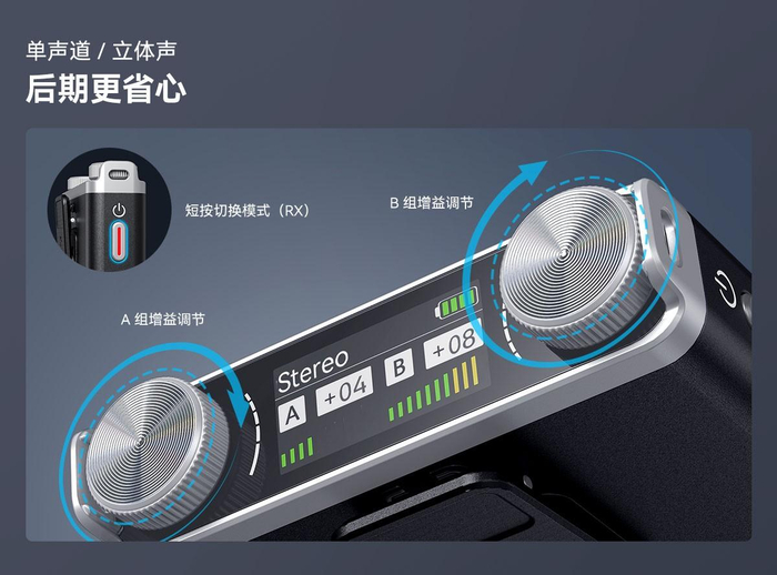 为应对单兵作战使用场景,发射器(TX)和接收器(RX)均带独立屏显,可实时查看录音模式/录音动态/电量。单声道(Mono)/立体声(Stereo)模式支持一键切换,在立体声模式下,可单独调节A/B组发射器的增益大小,提高前期录制/后期编辑效率。