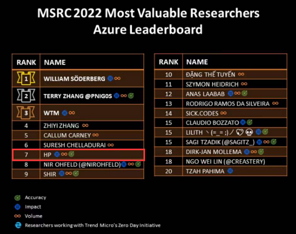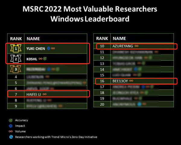 首先,在8月9日,微软安全响应中心(MSRC)发布了2022年度全球“最具价值研究员”榜单。该榜单汇总了全球安全研究人员在过去一年中的研究成就,严格选取最靠前的一百名选入。 今年的榜单中,赛博昆仑首席技术官、昆仑实验室负责人Yuki Chen(古河)技压群雄,拿下总榜榜首金交椅,这对他本人来说,已经是第三次登上这个榜单的顶峰,这在全球都是绝无仅有的。同时,昆仑实验室总共拿下了包括第11(K0SHL)、12(HP)、18(BEE13OY)、21(HAIFEILI)、31(AZUREYANG)、89(YANZISHUANG ANRUOYAN)的七个榜位,从而一举成为本次中国乃至全球厂商与安全研究机构中登上榜单人数最多、最亮眼的一队。