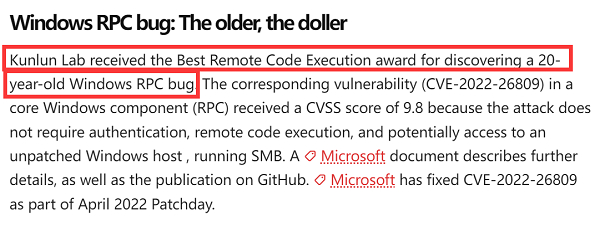 首先:昆仑实验室因发现已潜伏二十多年之久的Windows RPC bug,获得年度“最佳RCE(远程代码/命令执行)”奖项。