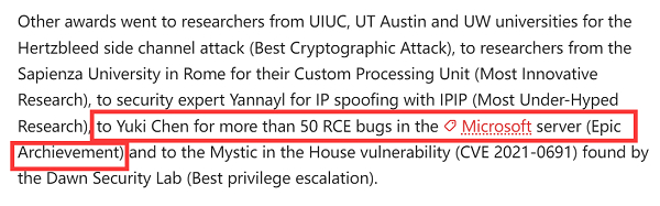 而昆仑实验室的Yuki Chen(古河)则再次大发神威,凭借Windows服务器侧的安全研究成果,获得年度“史诗级成就奖”。在官方公布获奖名单的页面上可以看到,Yuki Chen今年在Microsoft 服务器领域已经有超过五十项安全研究成果。