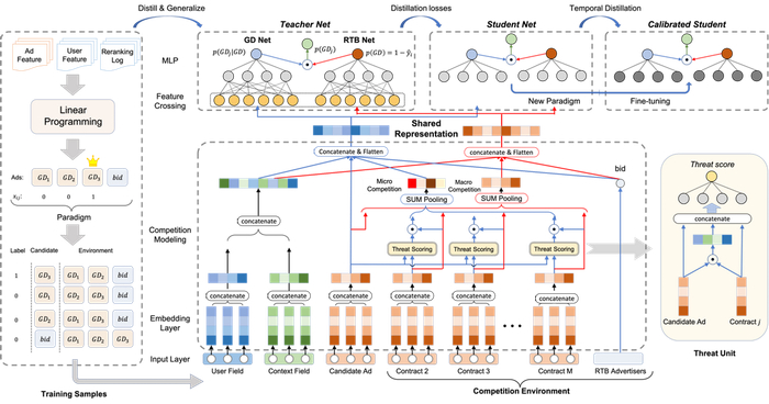 该研究提出了一种创新的请求级融合排序框架CONFLUX,通过在两种不同业务逻辑的广告市场,即合约和效果广告之间合理的分配曝光以提升平台总体收益并保证广告投放效果。该框架基于级联式的结构设计:首先通过线性规划生成分配范式,将原问题有监督化。然后利用复杂深度学习模型在请求级粒度上建模广告之间的竞争关系,并将范式提炼为可供轻量级模型学习的经验信息。在线上服务阶段,为了缓解模型衰退并适应线上分布迁移,本文引入时序蒸馏损失。通过在新旧模型之间保留有用信息,周期性的微调线上服务模型同时防止过拟合现象的发生。这一工作流程类似于化学中的级联蒸馏并因此得名。CONFLUX算法被实际部署于腾讯广告系统并运行超过六个月。线上A/B测试以及与基线方法的对比都表明本文提出的方案能在保证广告投放效果的同时,显著提升平台总体收益,实现广告主和平台的共赢。