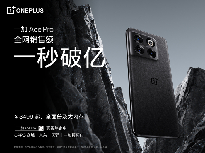 8月15日上午10点,一加 Ace Pro 全渠道正式开售,首销即斩获全网销售额1秒破亿的佳绩。一加 Ace Pro一经发布便大受好评,媒体称其“将一改往日用户对传统性能手机‘参数没输过,体验没赢过’的固有印象”、“是一款真正的性能手机新标杆”。一加 Ace Pro 全系 12GB 起步,至高配备 16 GB 大内存,售价3499元起。一加中国区总裁李杰此前就在微博透露,16 GB 版本预定量占总预定量的80%以上,充分表明大内存是用户的刚需,大内存带来的极致体验将会是“旦用难回”的。