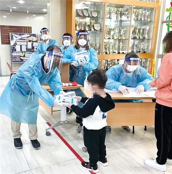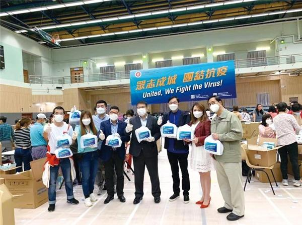 女儿陈雅仪小姐与同事们在不同社区中心做义工,帮助政府将抗疫中药“连花清瘟胶囊”、口罩、快速测试和心意卡等物资放入包装袋