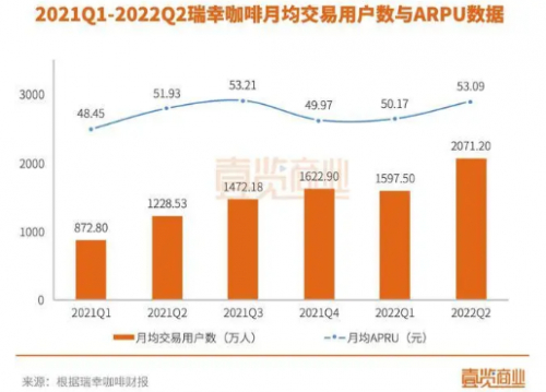 消费者数据层面,第二季度瑞幸咖啡月均交易用户数达到2071.2万人,同比增长68.59%,每个用户月均贡献营收53.09元,同比增长22.41%。